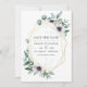 Trendy eucalyptus greenery and poppy flowers in pastel shades wedding invitation with gold geometric frame and elegant typography. Ideal for any given theme or garden wedding.