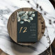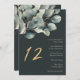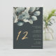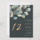 Elevate your wedding reception with this elegant table number and seating chart featuring a sophisticated eucalyptus foliage design. The soft, muted eucalyptus leaves, accented with touches of gold, adorn the top of the card against a rich, dark background. The table number is prominently displayed in a sleek script, complemented by a neatly arranged list of guest names in a refined serif font. This stylish seating chart perfectly blends modern elegance with a natural touch, ensuring your guests find their seats with ease and grace. Ideal for weddings or any formal event where beauty and organization meet.