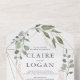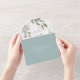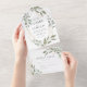 This elegant watercolor wedding all in one invitation features a white background with eucalyptus and faux gold leaves framed by a faux gold geometric frame. The reverse side features a sage green background. Personalize it for your needs. You can find matching products at my store.