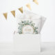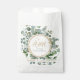 Here you may accomplish a sweet addition to your wedding personalizing this minimal cute favor bag that features, our collection's associated design of a delicate eucalyptus wreath and gold glitter around to play with your initials above the wedding date and location.