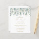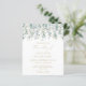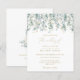 A botanical greenery watercolor eucalyptus wedding invitation. An elegant green eucalyptus wreath decorated with gold foliage and splashes is seen hanging down above the gold text. Personalize by adding your full event details.