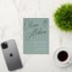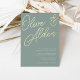 A beautiful typography based wedding invitation featuring your names in oversized gold foil script lettering at the top. Personalize with your wedding details in classic serif lettering aligned at the lower right. Our Eucalyptus colorway is an elegant mix of dusty greens, featuring pale green and white lettering on a sage green background.