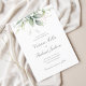Beautiful Save the date card featuring watercolor eucalyptus and gold leaves with calligraphy script.