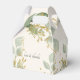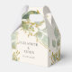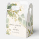Elegant wedding favor box adorned with watercolor eucalyptus leaves and delicate gold floral accents. The green, gold, and ivory color scheme makes it ideal for rustic chic, garden, or modern botanical weddings. Personalize it with your names and date for a cohesive finishing touch to your celebration.