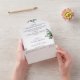 This elegant yet rustic design features moody dark green watercolor leaves and eucalyptus with a modern bohemian feel. All-in-one card includes wedding invitation, details, an engagement photo, and a self addressed RSVP card that your guests rip off and mail back to you. Personalize the cover with your names and wedding date framed by gold geometric greenery frame. This "roomy" invitation is a great way to give your guests additional information on the wedding. These cards can list the festivities surrounding your wedding weekend, such as welcome cocktails, after-parties, and morning after brunches. If you’re planning a destination wedding, all-in-one invitations are a great way to provide information to your guests about local hot spots and area attractions to help them make the most of their travel plans.