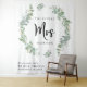An elegant photo booth backdrop tapestry for your bridal shower featuring a sage green watercolor wreath of eucalyptus greenery and "The Future Mrs" in a large script and modern typography. Personalize with the bride's married and first names and shower date. A bottom corner is left blank for an area for your guests to take pictures.