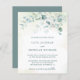 Elegant budget wedding invitation featuring eucalyptus leaves and greenery along with your event details over a pastel watercolor wash. The backside is a matching shade of soft blue green. This simple, rustic design is great for a botanical themed wedding in the summer. These cheap wedding invitations are printed on sheets of paper for a budget friendly option.