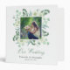 This wedding photo binder features a square photo frame with a border of lush greenery, eucalyptus and light green flowers. The design offers custom text for the names of the bride and groom and their wedding date. This is a perfect place to keep your wedding photos and memories.
