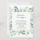 This elegant wedding invitation features a thick border of lush greenery, eucalyptse and flowers. The design is accented with handwritten style text for the names of the bride and groom.
