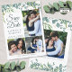 Announce your wedding date with these beautiful elegant watercolor dusty blue and green eucalyptus and greenery with coordinating sage green text featuring 4 engagement photos (3 on the front and 1 on the back). ASSISTANCE: For help with design modification or personalization, color change, resizing, transferring the design to another product or if you would like coordinating items, contact the designer BEFORE ORDERING via the Zazzle Chat MESSAGE tab or email makeitaboutyoustore@gmail.com.