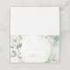 Modern wedding folded place card featuring eucalyptus leaves and greenery surrounding a faux gold geometric frame, over a pastel watercolor wash. The inside is a matching shade of soft blue green. This elegant, rustic design is great for a botanical themed wedding in the summer.