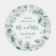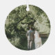 Elegant ornament featuring a wreath comprised of eucalyptus leaves and greenery with a hint of blue with "Our First Christmas as Mr. and Mrs." along with your last name and year in dark green over a pastel watercolor wash. The backside has your favorite wedding photo. This rustic, botanical ornament also makes a great gift for a newlywed couple for their first Christmas.