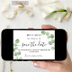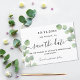 A modern and elegant Save the Date for a wedding. A white decorated with eucalyptus greenery stems, sprigs. Personalize and add a date and names. The text: Save the Date is written with a large trendy hand lettered style script.