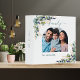 Personalize and add your own family photo inside an arch frame. Decorated with eucalyptus greenery and faux gold foliage. Elegant white background. Add your family name.