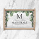 Rustic white wood with eucalyptus greenery serving tray with the couples first names, last name monogram, full last name, and wedding date available in customizable templates.