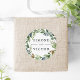 Seal your invitation envelopes or favors with these elegant botanical wedding stickers featuring your names framed by a watercolor wreath of green eucalyptus foliage, leaves and tiny navy blue buds on a white background. Coordinates with our Eucalyptus Grove wedding collection.