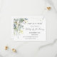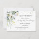 This design features a watercolor illustration of greenery foliage and eucalyptus leaves. On the top - golden and greenish effect confetti.