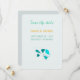 This editable save the date card revolves around turquoise colours, with eucalyptus leaves from this range at the bottom and back and the name of the bride and groom in orange at the top.