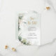 This design blends natural elegance with refined charm, featuring a soft botanical design of green eucalyptus foliage and shimmering gold accents that frame the layout with grace. The color palette evokes a serene, upscale garden atmosphere, while the mix of classic serif and flowing script fonts adds a sense of romance and rustic charm. The overall composition feels balanced and welcoming, perfect for a celebration set in a vineyard or similarly picturesque venue, where tradition meets warmth and joy.