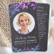 Rustic Chalkboard Eucalyptus Sympathy Funeral Prayer Cards. This rustic yet elegant memorial prayer card features a blue purple pink eucalyptus greenery on chalkboard slate design . Front "In Loving Memory" Personalize this memorial funeral prayer card with your loved ones photo, name & dates, and sentiment. Back ~ 'May You Always Walk In Sunshine' Poem, which can be personalized, please reach out if you would like a design with a specific poem other than. This memorial prayer card will be a treasured keepsake, for funeral services, and celebration of life. COPYRIGHT © 2020 Judy Burrows, Black Dog Art - All Rights Reserved. Rustic Foliage Memorial Photo Funeral Prayer Card