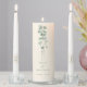 Eucalyptus Names Date Initials Sage Ivory. A branch of Watercolor eucalyptus in sage green flows from the top of the large candle, on an ivory background. The two white taper candles each have an initial within a band of ivory. The text in sage can be easily personalised with your names, wedding date and initials.