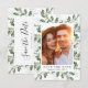 This beautiful wedding save the date card has a vertical photo against a frame of watercolor eucalyptus leaves. The words underneath the photo say Save the Date with space for the wedding date. On the back of the card you can add your names, the wedding date and location of your wedding.