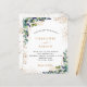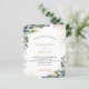 A white background decorated with eucalyptus greenery and golden foliage. Personalize and add your names and wedding details. Black and golden colored letters.