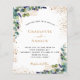 A white background decorated with eucalyptus greenery and golden foliage. Personalize and add your names and wedding details. Black and golden colored letters.