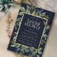 Chic botanical bridal shower invitation features a border of lush sage green botanical leaves and watercolor eucalyptus foliage with gold foil trim. Personalize with your bridal shower details in modern lettering on a midnight blue background.