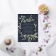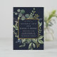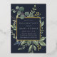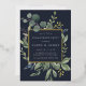 Our Eucalyptus & Sage engagement party invitation frames your party details with an elegant square border of lush watercolor eucalyptus and sage green leaves, with real gold foil trim on a rich midnight blue background.