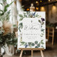 Chic botanical welcome sign for baptisms, christenings, or baby dedications features a border of lush sage green botanical leaves and watercolor eucalyptus foliage. Personalize with your details.