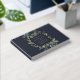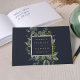 Our Eucalyptus & Sage wedding guestbook frames your names and wedding date with an elegant square border of lush watercolor eucalyptus and sage green leaves, with luxe gold foil trim against a rich navy blue background.