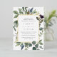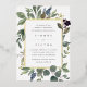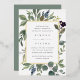 Elegant botanical wedding invitation frames your wedding celebration details with a border of watercolor eucalyptus leaves, blue flowers, and green foliage. Luxe gold foil trim completes the design.