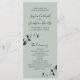 Emerald Hued Eucalyptus on Sage Romantic Calligraphy Wedding Ceremony Program... Emerald-hued watercolor eucalyptus leaves frame your ceremony details on our custom designed wedding program template. Above the order of ceremony information is a welcome greeting with the names of the bride and groom in romantic calligraphy script and the wedding date and location just below. On the light sage back of the card are the names of the members of your wedding party in elegant serif typography. You can revise the example text step-by-step with your own details and names using the "Personalize" template. Part of a wedding suite with coordinating accessories in the same eucalyptus sage theme.