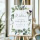 Elegant green botanical wedding welcome sign features a border of lush sage green botanical leaves and watercolor eucalyptus foliage. Personalize with your names and wedding date.