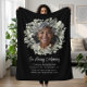 Personalized memorial photo blankets offer a comforting and heartfelt way to honor the life of a loved one. This custom "In Loving Memory" blanket design features a centered photo framed by a delicate watercolor eucalyptus and white floral wreath, set against a rich black background for a timeless and elegant tribute. Below the portrait, customizable name, dates, and a touching remembrance quote add a meaningful personal touch that brings warmth and emotional significance to the piece. Ideal as a sympathy gift, keepsake, or display at a celebration of life or funeral service, this tribute blanket provides comfort while preserving cherished memories in a visually stunning way. The calming botanical elements and minimalist layout create a modern yet respectful aesthetic suitable for any memorial setting. Whether draped over a chair, displayed during a service, or kept as a lasting memento at home, this custom memorial blanket serves as a beautiful way to keep a loved one’s memory close.