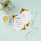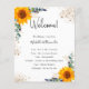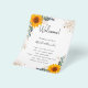 A modern, elegant, wedding program, timeline. A chic white background. Decorated with sunflowers, green watercolored eucalyptus leaves, sprigs, greenery, faux gold leaves and golden glitter spots. Personalize and add your names and wedding details. Black colored letters. If you have more text it's possible to reduce the line space.