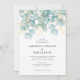 This wedding invitation features a beautiful watercolor graphic of light teal blue colored eucalyptus accented with gold botanical.