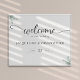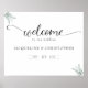 The chic wedding welcome design features a bouquet of watercolor eucalyptus greenery and an elegant sophisticated set of fonts.