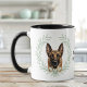 "LOVE MY BELGIAN MALINOIS" declares this mug for the proud Malinois dog owner. Each side of the mug has a beautiful portrait of a Belgian Malinois framed by soft green watercolor eucalyptus leaves. Between the two images is the text, which may be easily customized, or even removed by you, and your monogram or name.