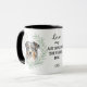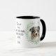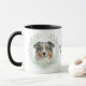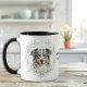 "LOVE MY AUSTRALIAN SHEPHERD DOG" declares this mug for the proud Aussie dog owner. Each side of the mug has a beautiful portrait of a Blue Merle Australian Shepherd dog framed by soft green watercolor eucalyptus leaves. Between the two images is the text, which may be easily customized, or even removed by you, and your monogram or name.