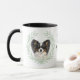 "LOVE MY PAPILLON DOG" declares this mug for the Papillon dog owner. Each side of the mug has a portrait of an adorable little black and white Papillon framed by soft green watercolor eucalyptus leaves. Between the two images is the text, which may be easily customized, or even removed by you, and your monogram or name.