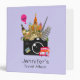 A travel album with a graphic illustration featuring European landmarks such as leaning tower of Pisa, Big Ben, Eiffel Tower etc... A hot air balloon in the sky and a double decker bus, with a large camera. A stamp with the Egyptian pyramids stuck to the camera.