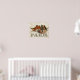 Five little European Robins sit together on a branch overlooking a nest and the word "Paris" in beautifully embellished lettering. The vintage ornate pattern in the background comes from an antique embroidered tapestry.