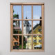 Poster that looks like a window -- Austrian town Austria has such pretty towns with brightly painted buildings and onion dome churches. Imagine you could wake up with that view... You can with this picture that looks like a window! Beyond the wooden window frame is a lovely street showing two town buildings, one painted a pretty yellow and one a warm orange, with their green shutters. Beyond that you can see the bell tower and the onion dome church spire. Taken in the beautiful town of Kitzbuehel in the Austrian Alps, Europe.