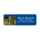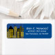An urban illustration of city buildings with a blue evening background. Personalize this label with your name or address. To change the blue background to another color, click on Customize It.