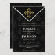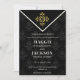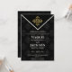 Elegant and stylish Evening Chic Wedding Invitation set on a patterned black background with a gold emblem.