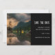 Save the date card with a beautiful photograph. An evening shot with mountains and a calm lake. Cottage lights off in the distance