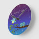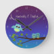 Two baby owls cuddle and settle down to sleep under a twilight sky of twinkling stars while mama owl watches over them. Easy to personalize or clear the text for artwork only. This design works for both the medium and large size clocks. Original Artwork by Night Owl's Menagerie, 2010.