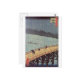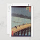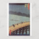 This Japanese color print was created by Ichiyusai Hiroshige in the 19th Century. The full name of the print is: "Evening Shower at Atake and the Great Bridge". This Japanese print is from the famous series: One Hundred Famous Views of Edo" (Meisho Yedo Hiakkei). In it we see a few Japanese workers crossing a large bridge, while a storm is raging, and a lot of rain is falling. They're covering themselves with straw hats, coats and perhaps umbrellas. In the background we also see a Japanese sailor on a canoe like boat crossing the river. The sky is quite dark because of the storm, and it's too dark to see the forests behind. The artist has also signed this artwork in Kanji characters and Hiragana (Japanese writing).